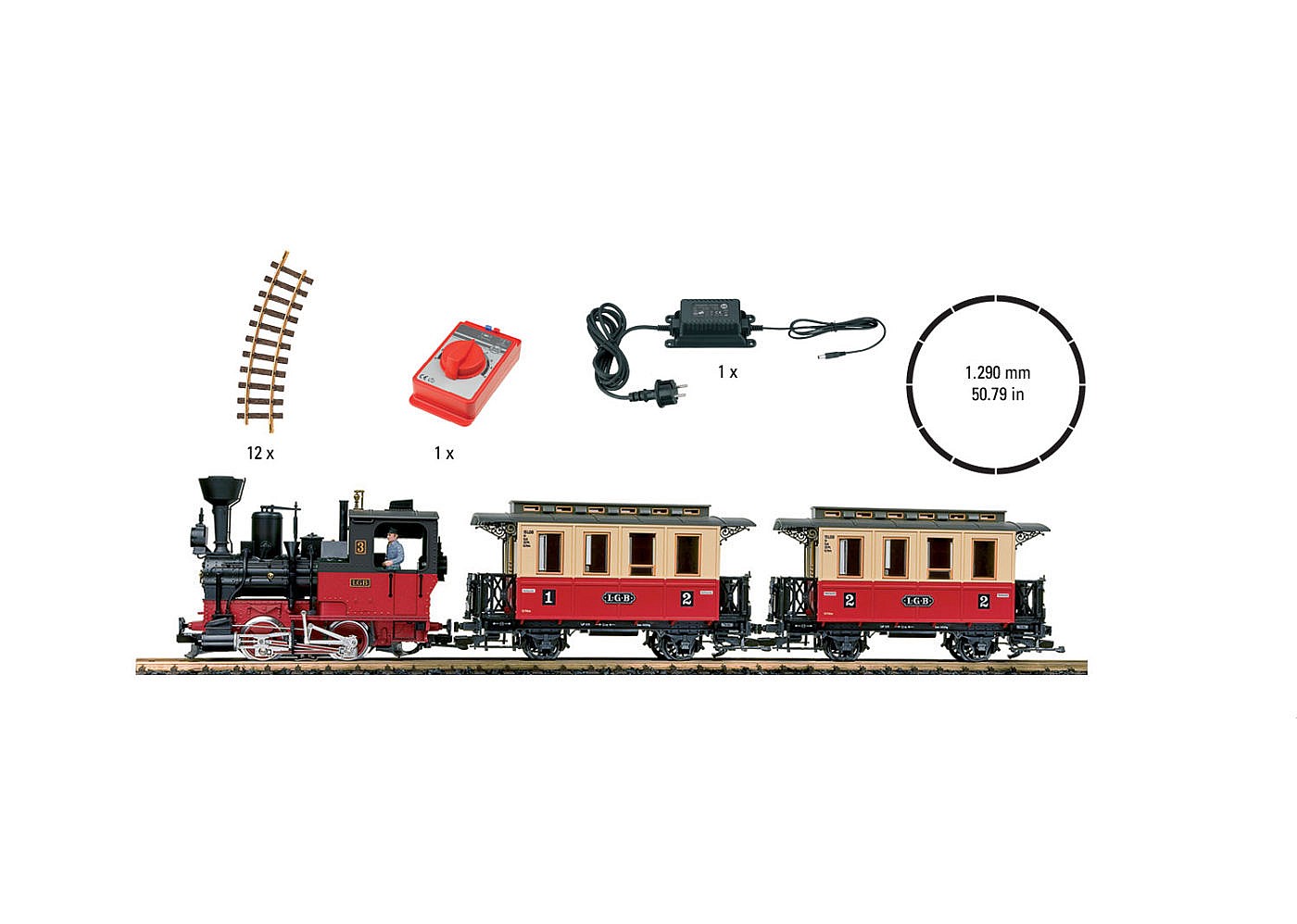 Tämä puutarhajunien aloituspakkaus sisältää kaiken, mitä tarvitset päästäksesi LGB-puutarhajunien jännittävään maailmaan. Sarjan mukana saat tehokkaan moottoroidun höyryveturin ”Stainz”, jossa on elektroniset äänitehosteet, kuten höyryveturin käyntiäänet ja savugeneraattori. Savugeneraattori antaa aidon höyryefektin. Setti sisältää myös kaksi matkustajajunan vaunua, teemakohtaisia ja mittakaavaisia figuureja. Tietenkin virtalähde ja ohjauspaneeli. Täysi raidekehä (1290 mm halkaisijaltaan oleva kehä). Junan kokonaispituus vaunuineen on 85cm. Kokoa vain ja aloita ajaminen!