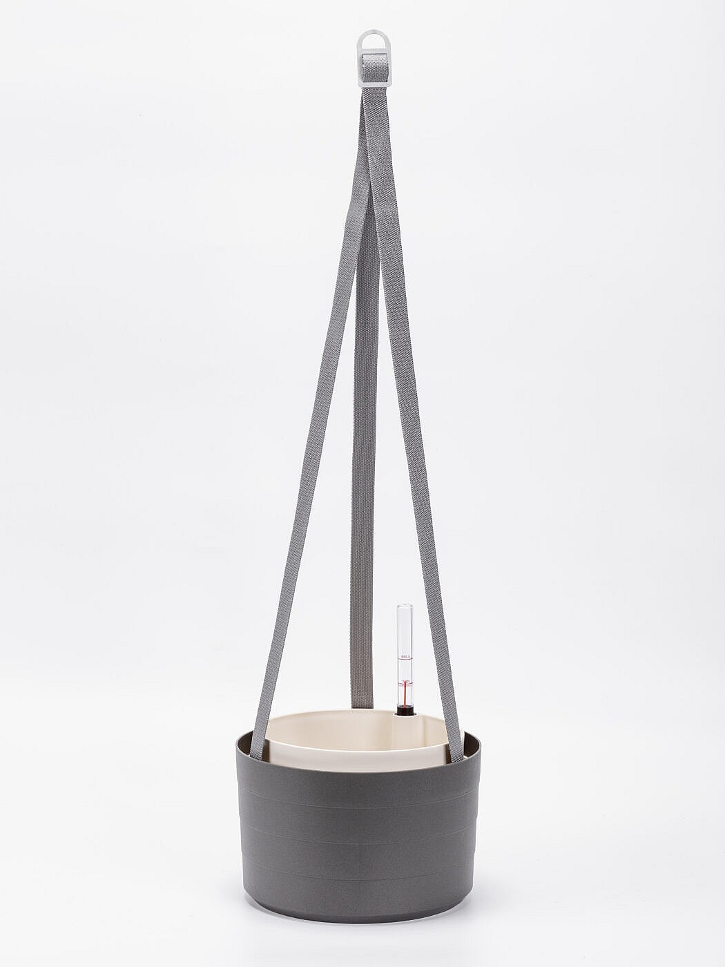 Itsekiinnittyvä riippuvalaisin Berberis-sarjasta. Säiliön alla on kasteluvesisäiliö, josta kasvit voivat ottaa juurineen oikean määrän vettä. Voidaan käyttää myös maakasviastiana ilman hihnoja.