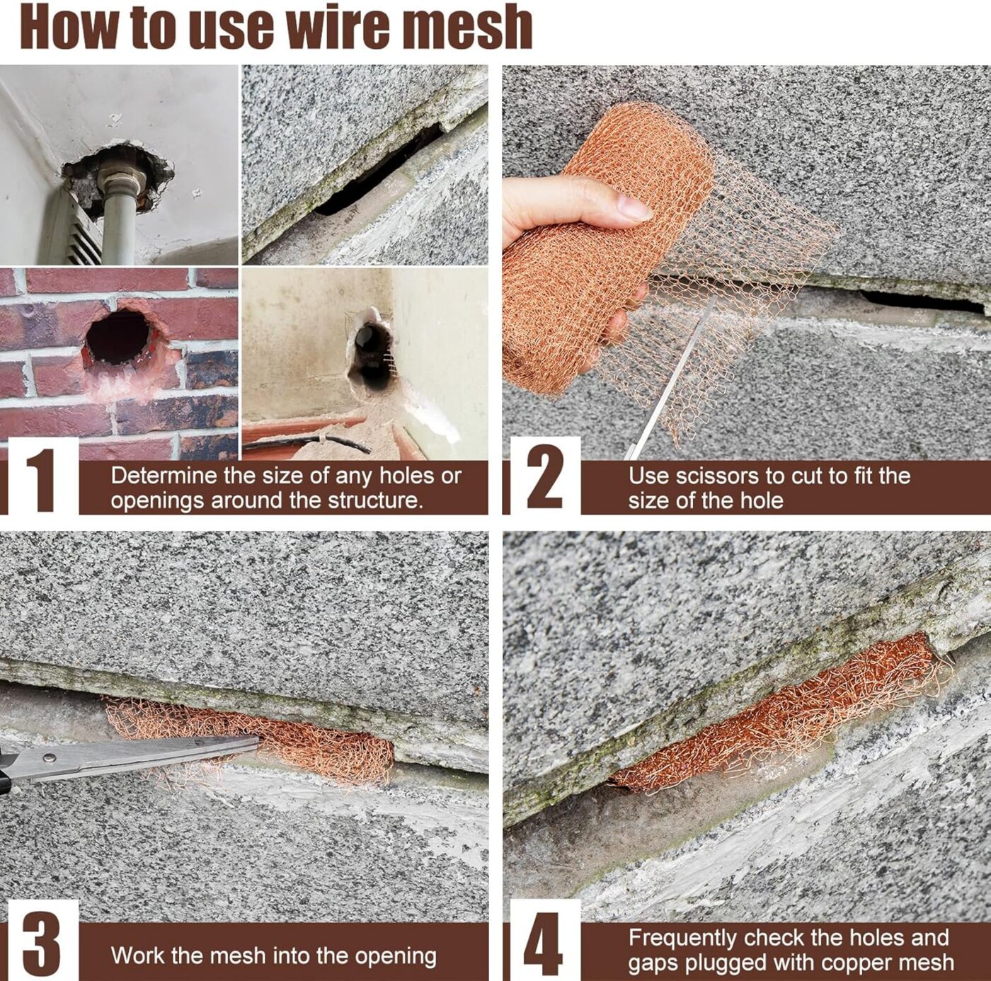 Tukkii tehokkaasti reiät: etanoita ja hiirenloukkuja estävää kuparikärkeä voidaan käyttää erimuotoisiin reikiin. Sopii viemärireikiin, putkien ympärillä oleviin halkeamiin, seinän halkeamiin, ullakon tuuletusaukkoihin ja kaikkiin muihin reikiin, jotka on tiivistettävä. Anti-snail-kuparikärki voidaan helposti työntää pieniin halkeamiin.