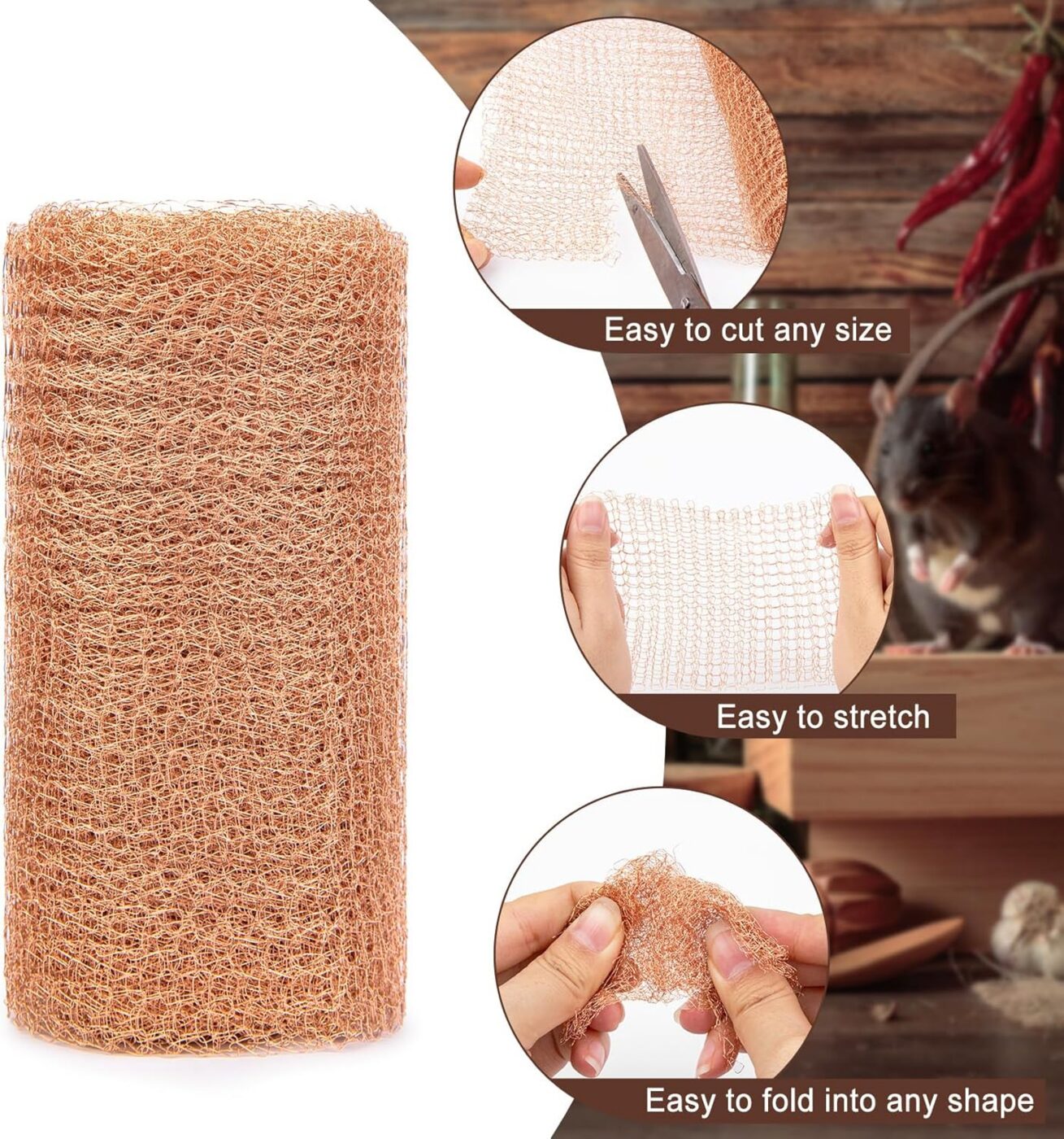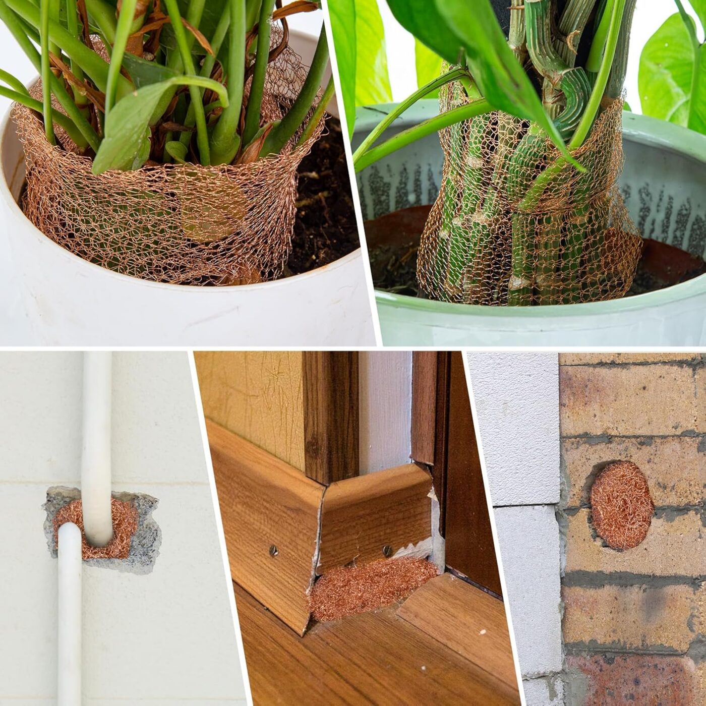 Toinen käyttötarkoitus on hiiren reikien sulkeminen. Hiiret ja rotat pureskelevat tiensä minkä tahansa läpi, jos ne ovat tottuneet menemään jonnekin. Mutta ne eivät voi pureskella kuparia. Tämä pitää ärsyttävät jyrsijät poissa rakennuksista. Puhdas ja myrkytön ratkaisu.