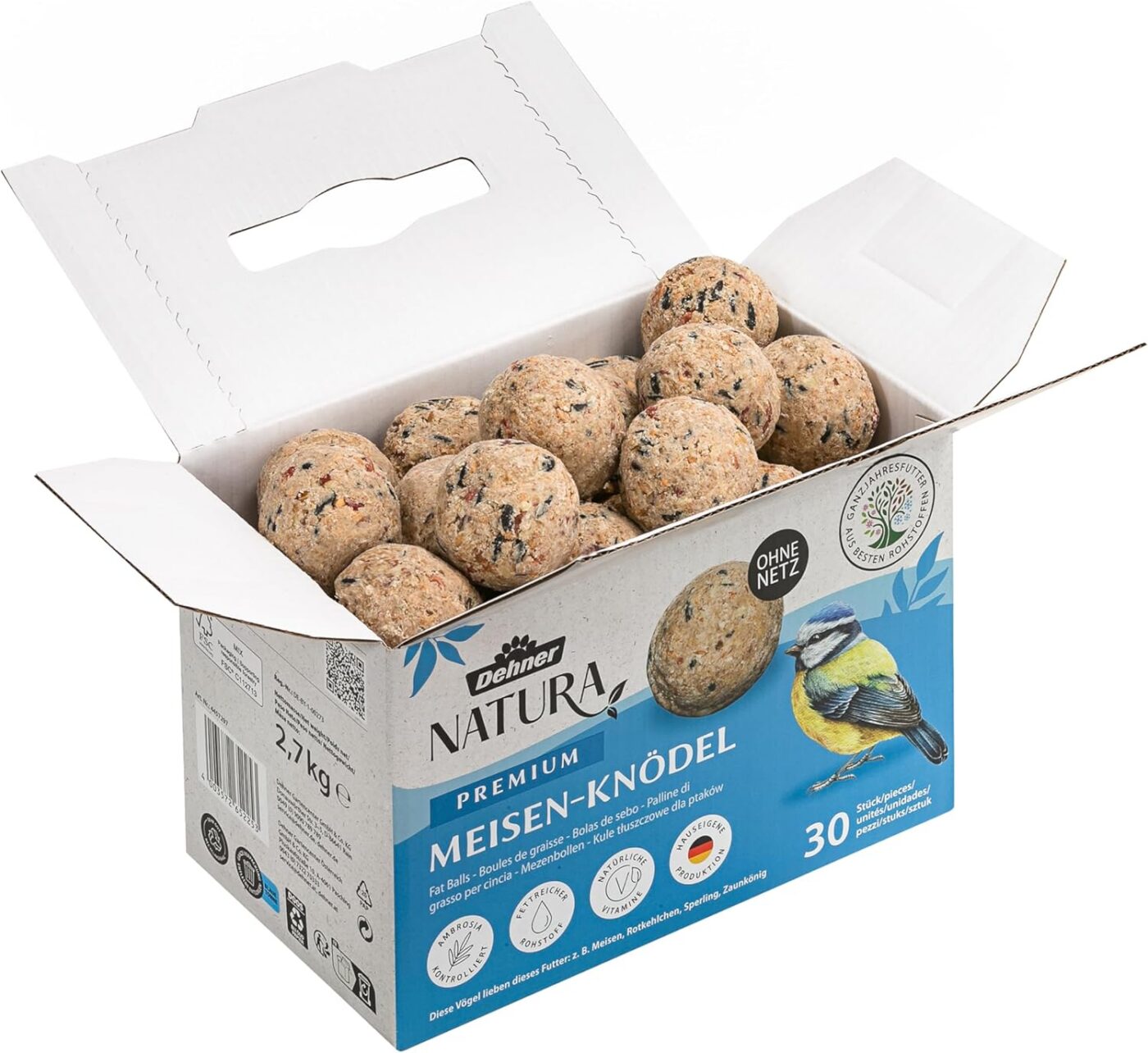 Saksalaiset asiantuntijat ovat luoneet rasvapallot lintujen tarpeita silmällä pitäen, joten kaikki ainesosat ovat korkealaatuisia. Rehupallomme eivät sisällä turhia täyteaineita, kuten tuhkaa, hiekkaa ja muita täyteaineita, jotka palvelevat vain kaupallista tarkoitusta mutta ovat linnuille sopimattomia ja vaarallisia. Näet nopeasti itse, miten linnut arvostavat niitä.