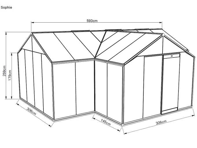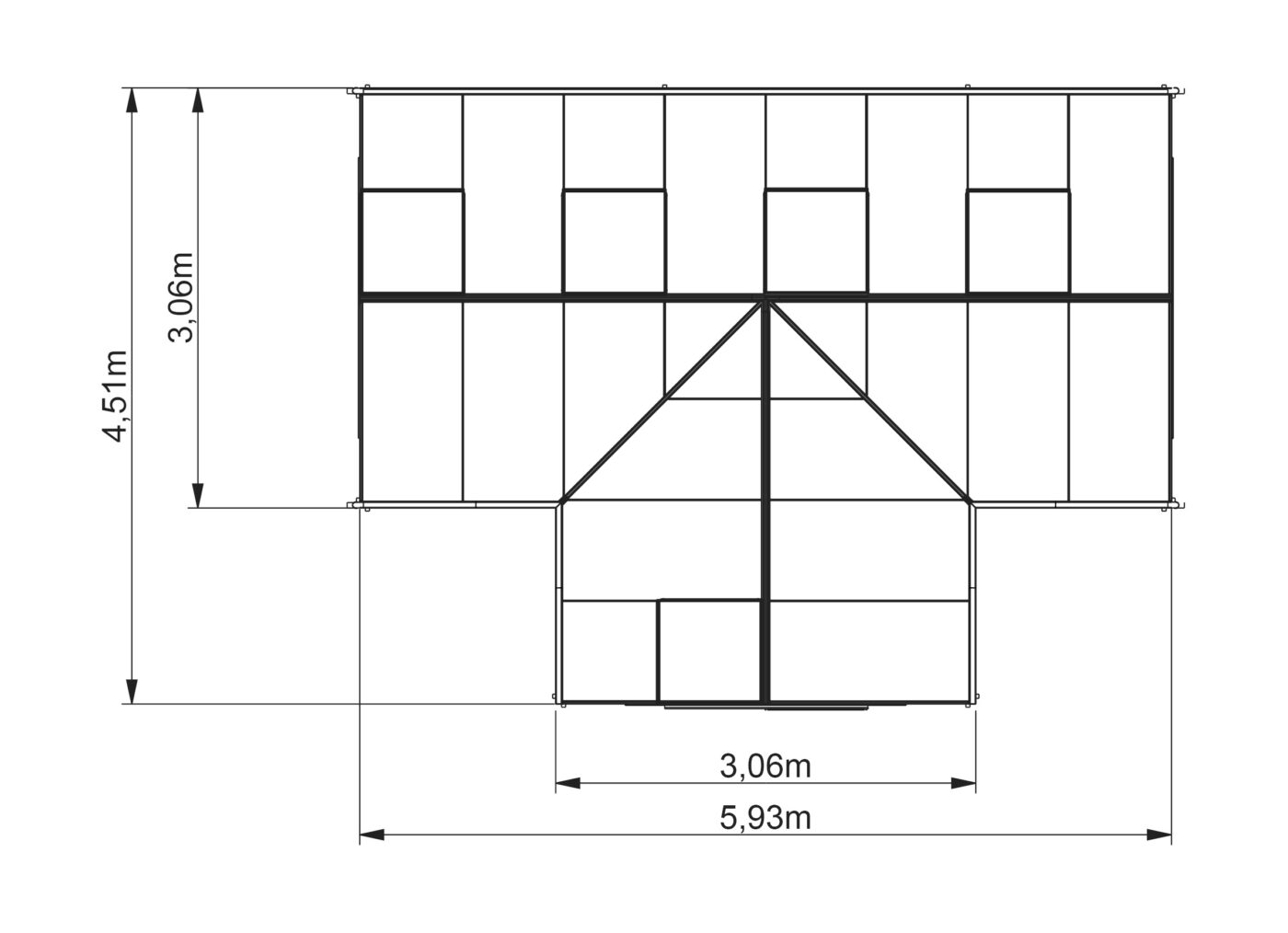 Kasvuhoone on T-kujulise põhiplaaniga. Kasvuhoone kogulaius on 451cm ja kogupikkus on 593cm. Otsaseinte laius on 306cm ja pindala on 22,6m2.